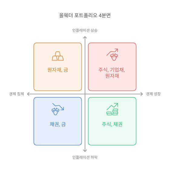 올웨더 포트폴리오의 4분면은 경제 상황에 따라 다음과 같이 구성됩니다